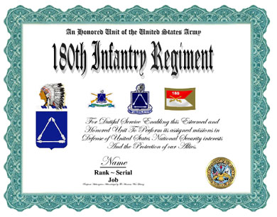 Authorized to all military and civilian personnel in service with or under command of the 180th Infantry Regiment. (Unit awards apply to members who served during the unit's award period. See Meritorious, Valorous, Presidential, Superior, Outstanding and other unit award categories.)