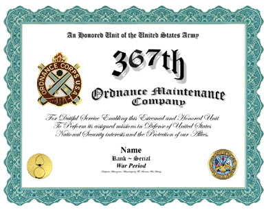 Authorized to all military and civilian personnel in service with or under command of the 367th Ordnance Maintenance Company. (Unit awards apply to members who served during the unit's award period. See Meritorious, Valorous, Presidential, Superior, Outstanding and other unit award categories.)