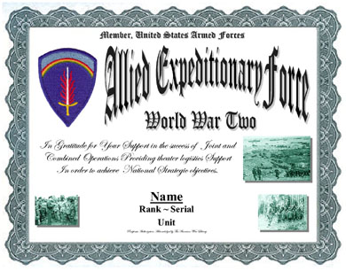 Authorized to all military and civilian personnel in service with or under command of the Allied Expeditionary Force, WW2. (Unit awards apply to members who served during the unit's award period. See Meritorious, Valorous, Presidential, Superior, Outstanding and other unit award categories.)
