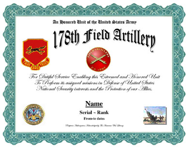 Authorized to all military and civilian personnel in service with or under command of the 178th Field Artillery. (Unit awards apply to members who served during the unit's award period. See Meritorious, Valorous, Presidential, Superior, Outstanding and other unit award categories.)