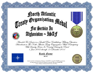 Authorized to all military and civilian personnel in service with or under command of the NATO, Afghanistan. (Unit awards apply to members who served during the unit's award period. See Meritorious, Valorous, Presidential, Superior, Outstanding and other unit award categories.)