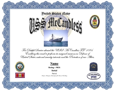 Authorized to all military and civilian personnel in service with or under command of the USS McCandless FF-1084. (Unit awards apply to members who served during the unit's award period. See Meritorious, Valorous, Presidential, Superior, Outstanding and other unit award categories.)