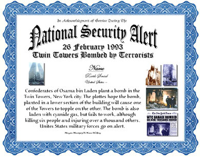 Email: National Security Alert: NY Twin Towers Bombed by Bin Laden Terrorists Display Recognition InquiryTelephone: 1-562-422-4100 (Pacific Time Zone)