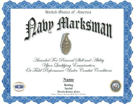 Authorized for qualifying performance per standards set at time of testing (which may vary at different times and at different test installations). Gunner's Mates automatically qualify for Marksmanship Level on all shipboard personal or field weapons.